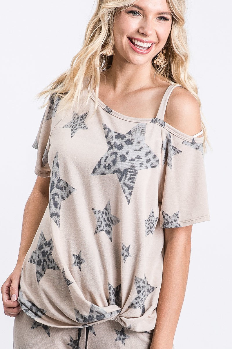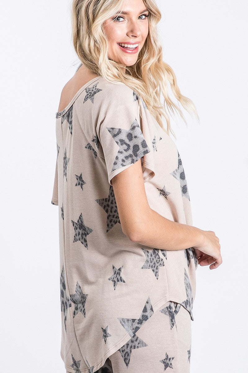 Adorable animal and star print top featured in an asymmetrical neckline and side knot hem. So comfy and cute at the same time. This top fits true to size.