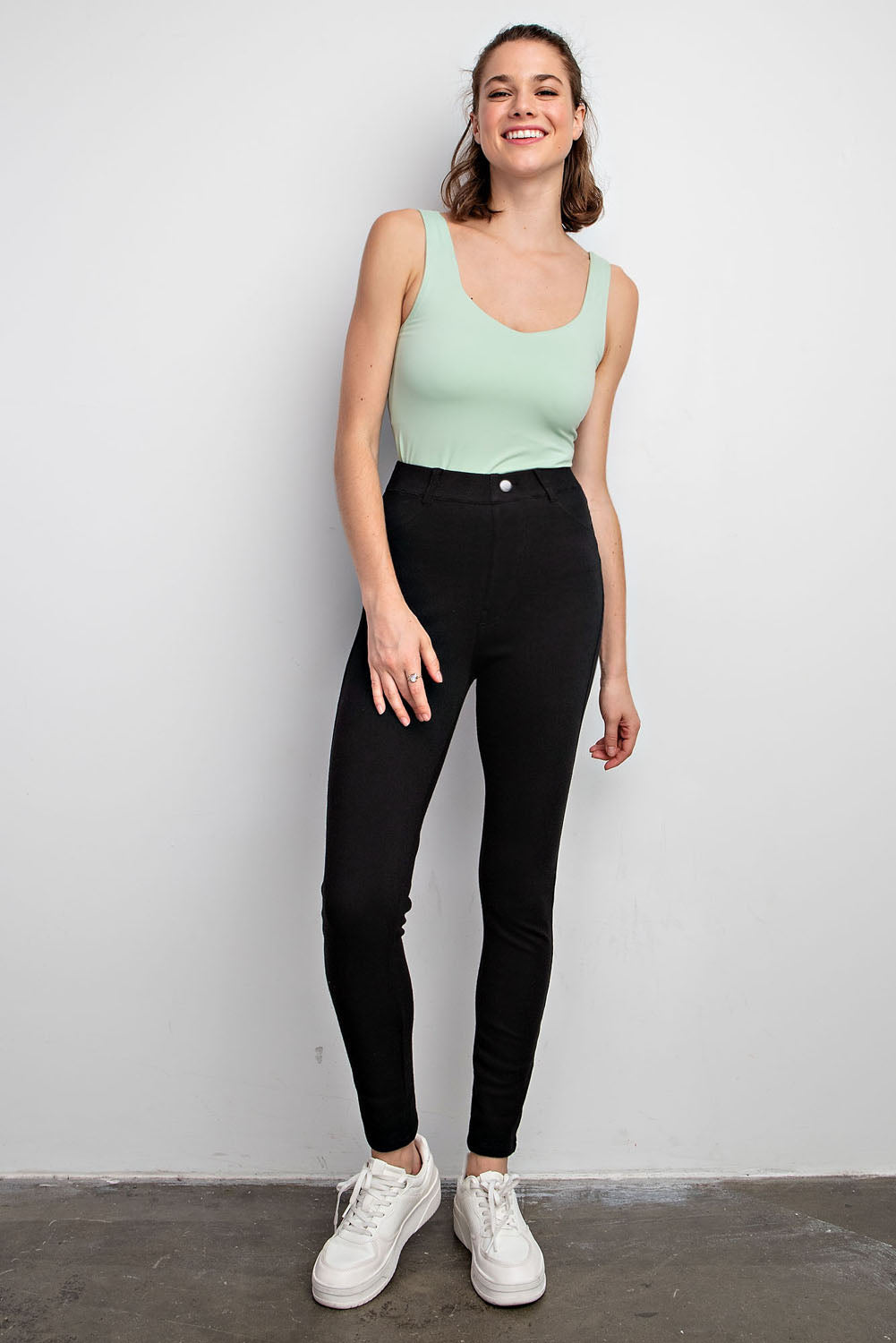These pants are the perfect mix of leggings and pants!! They are a pull-on pant with a legging-like fit. They have a pant-like look on the front and functional back pockets. Very cute and they have the ability to be paired with MANY things! A great versatile piece to have in your closet!!