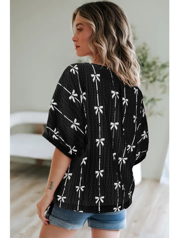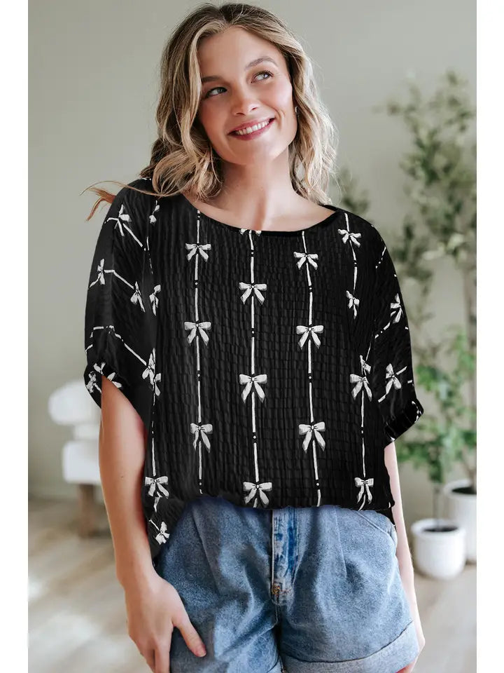 Adorable, black top with white bows. The material is a crinkle material which is wonderful because it's very hard to wrinkle. It is also a cool, lightweight material. You can dress this top up or down.