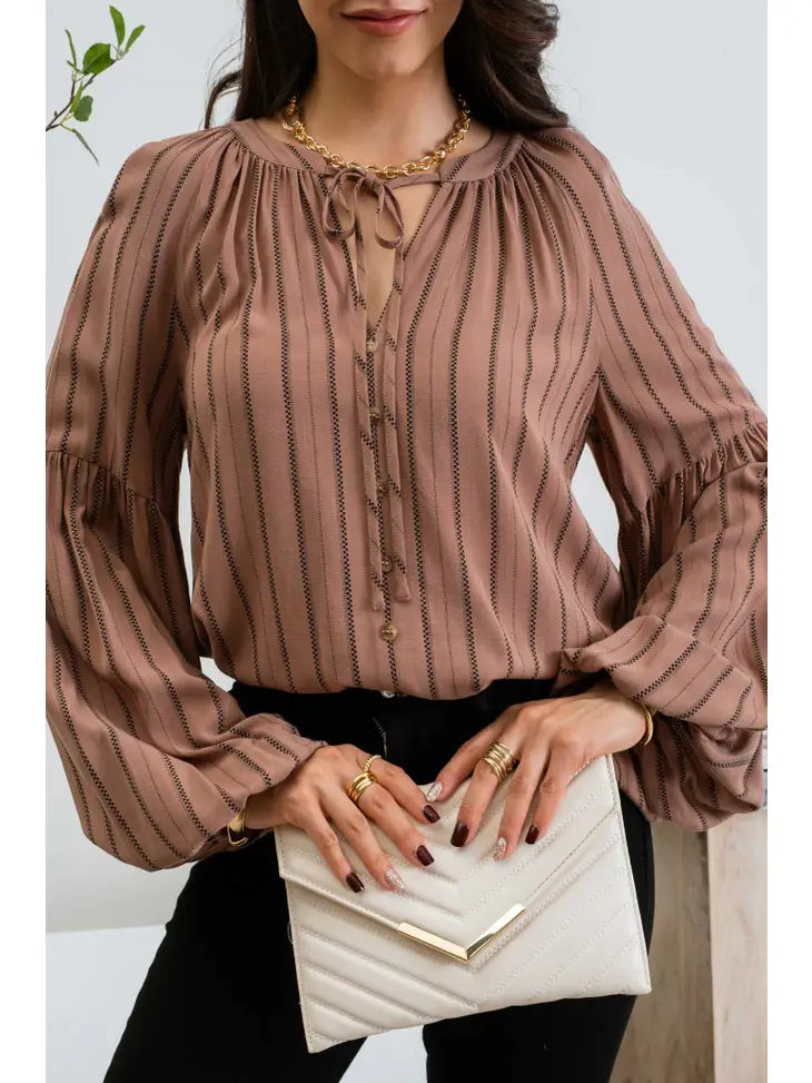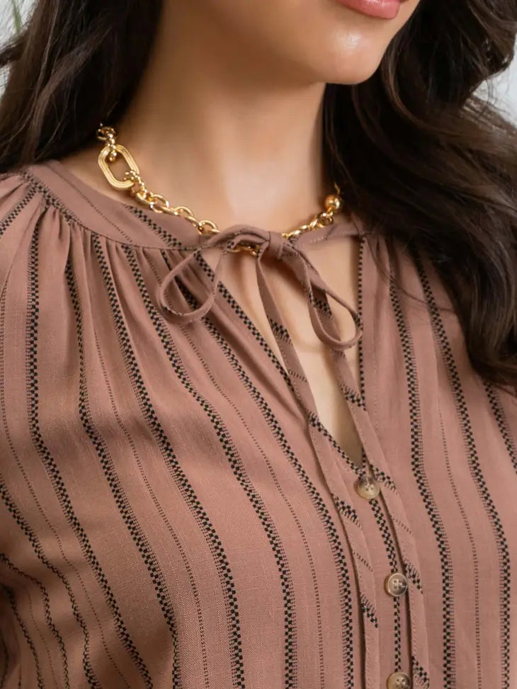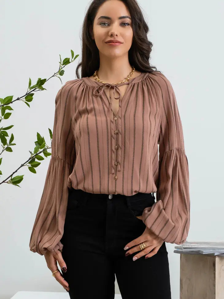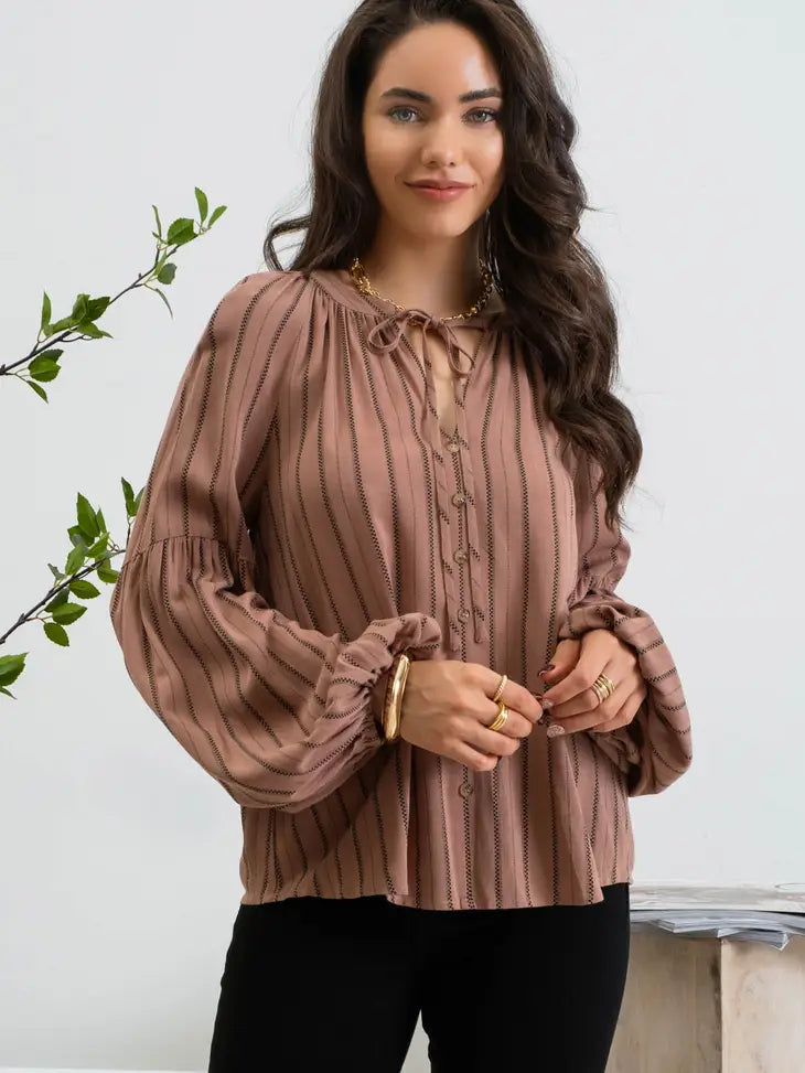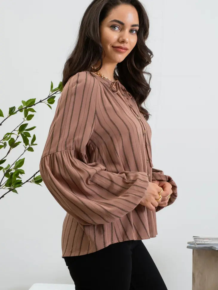 This is an adorable, peasant style, cinnamon color top with split neckline and a tie closure. The half balloon sleeve and vertical stripes give a super flattering look. It also has cute decorative buttons on the front.