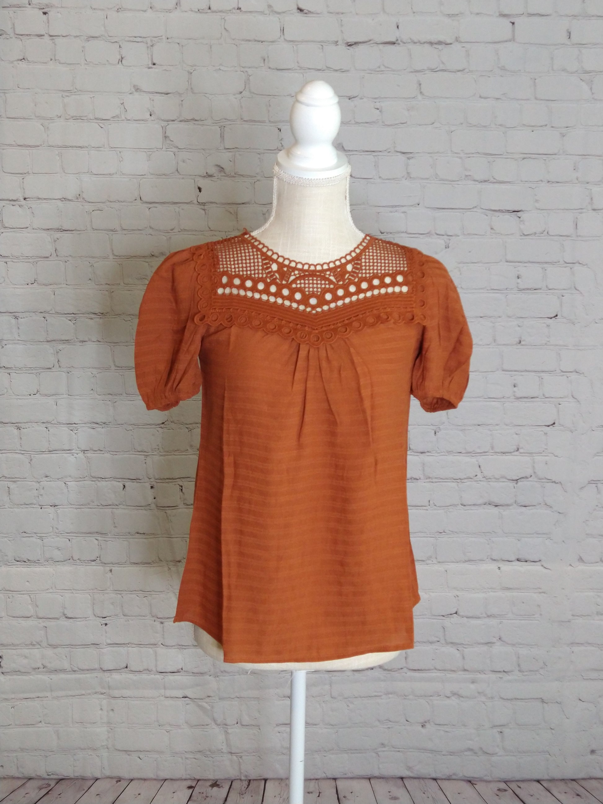 Beautiful dark rust color top with stripe. Puff sleeve and keyhole in back. 73% rayon 27% polyester.