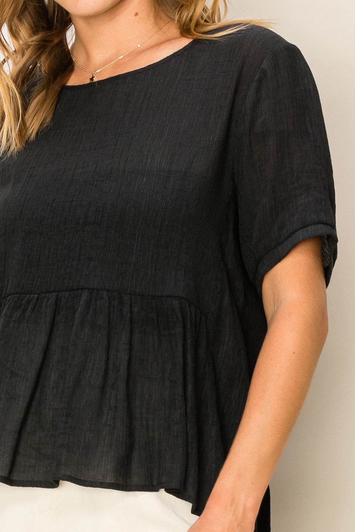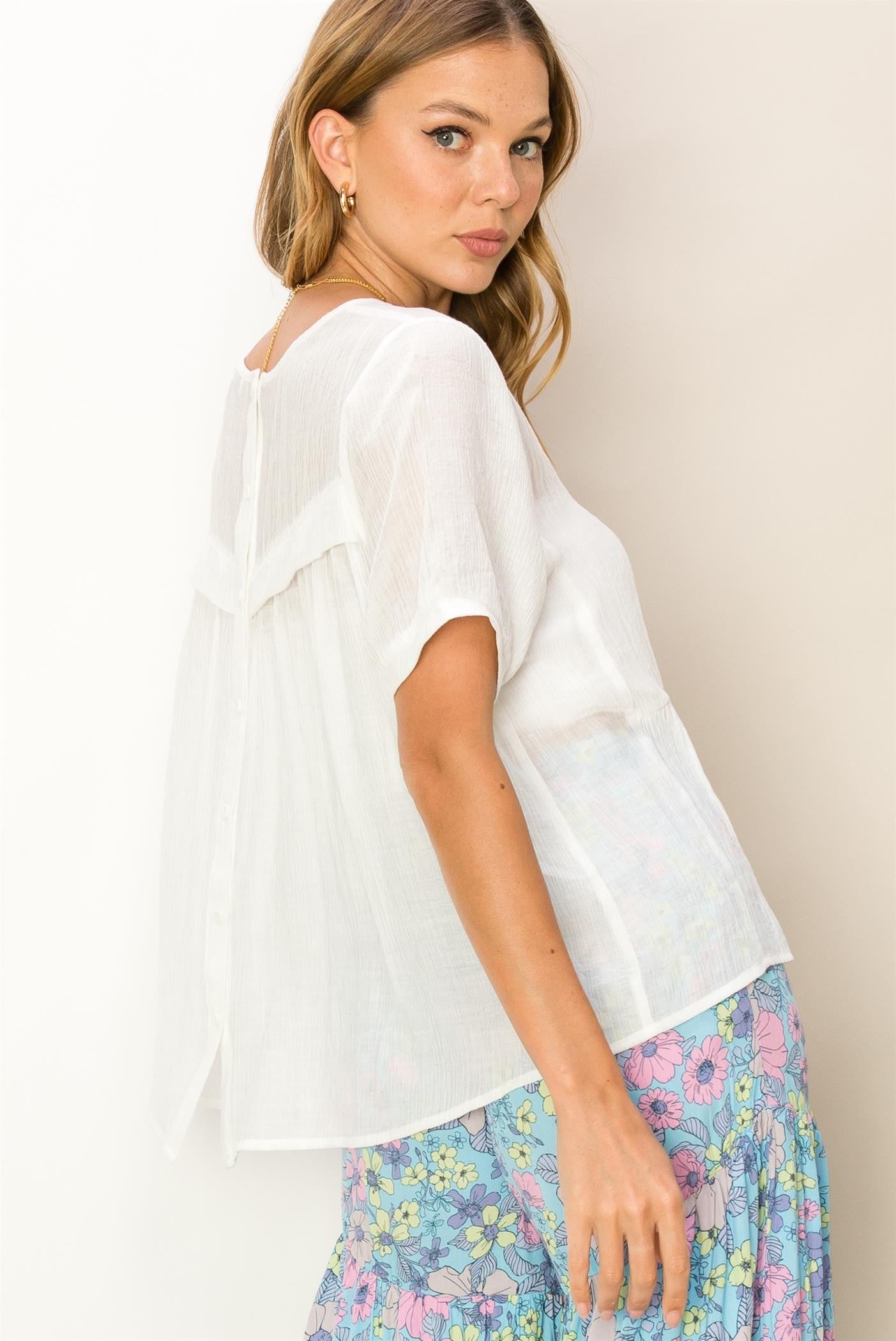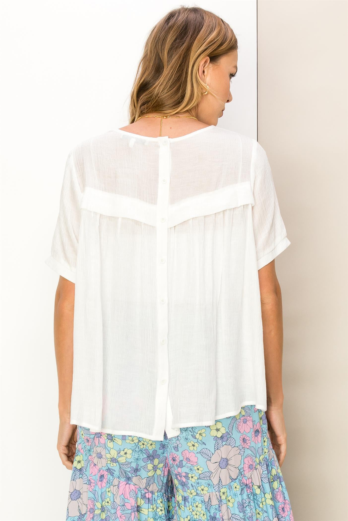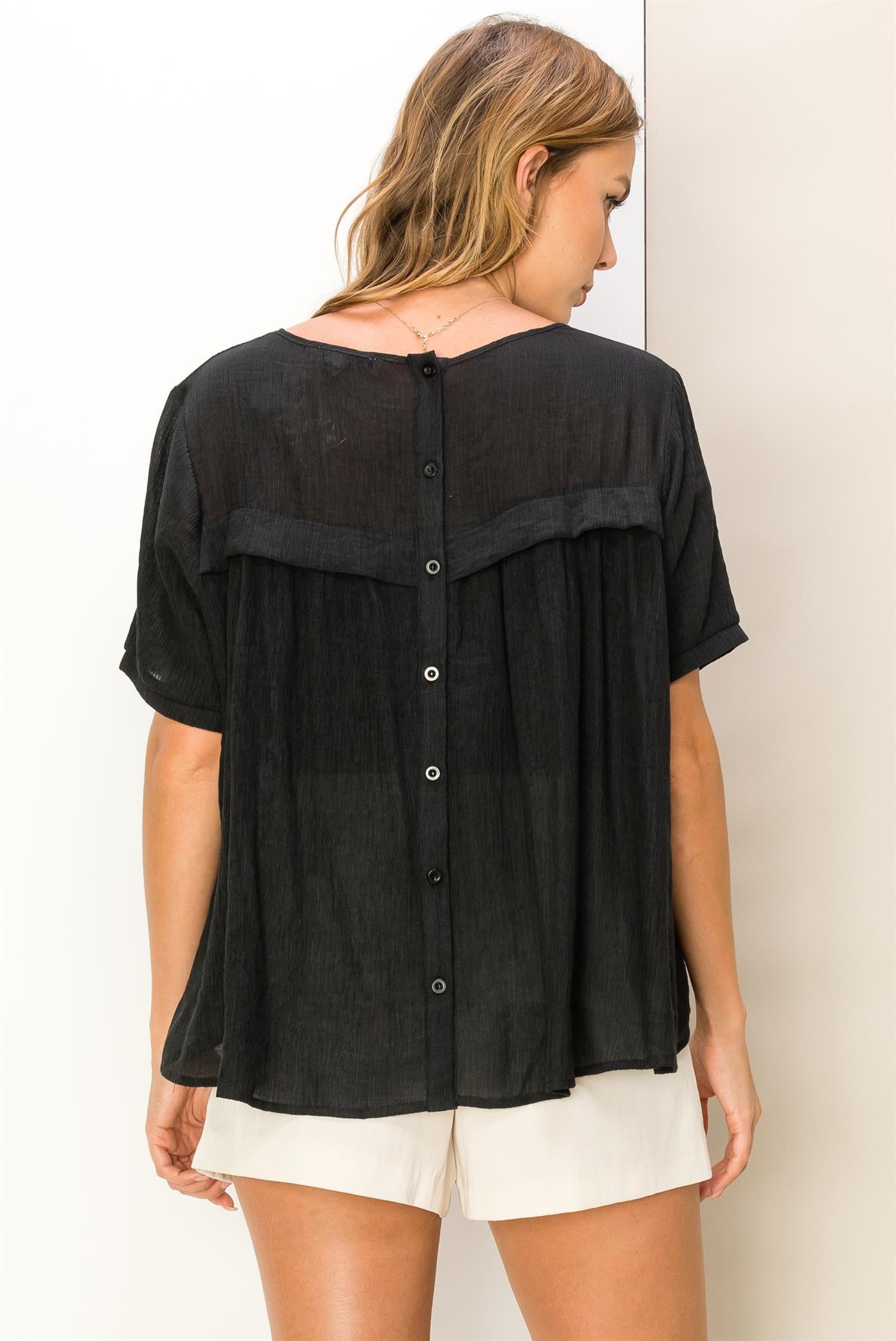 Simply adorable!! This top is the perfect addition to any outfit! Oversized babydoll style with button down back. Available in black or white.