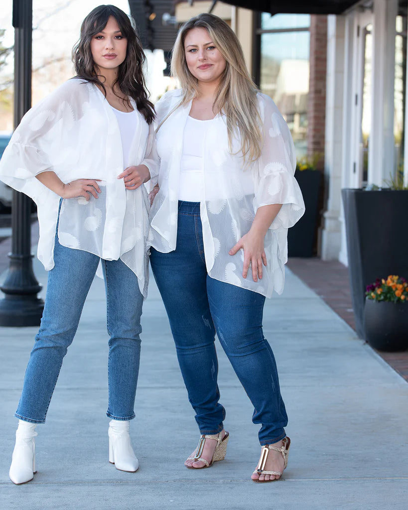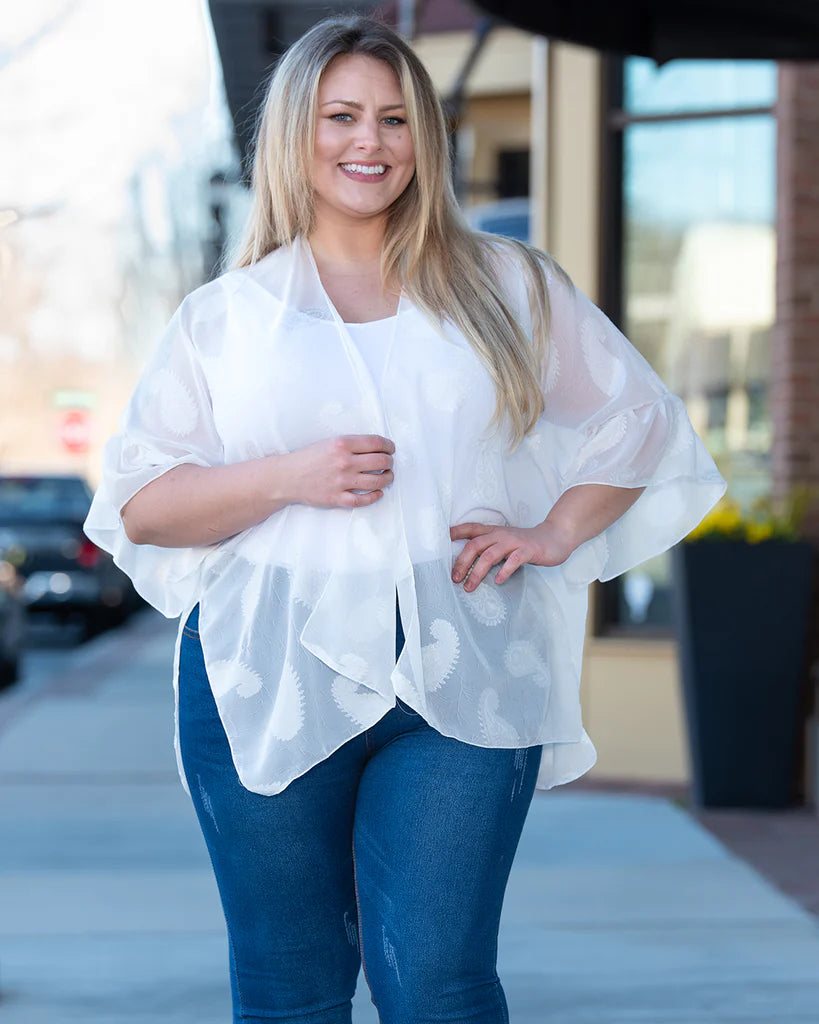 Super versatile white kimono with white paisley print. This kimono goes with everything!! It's an open front, lightweight kimono with ruffle sleeve. Perfect pair to your spring/summer outfit.
