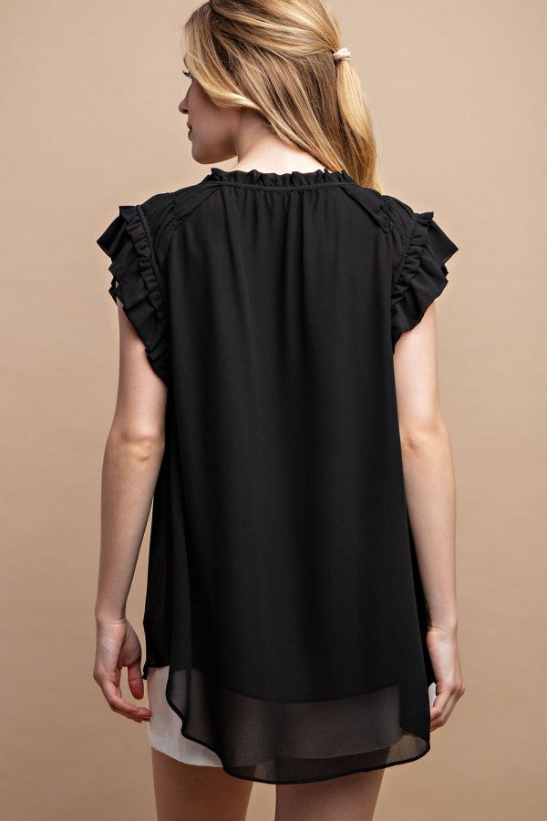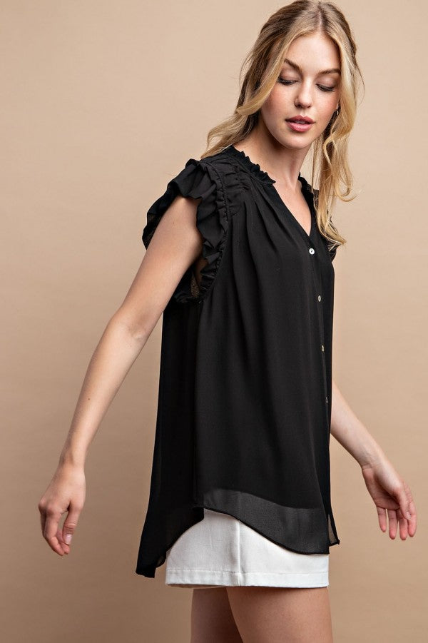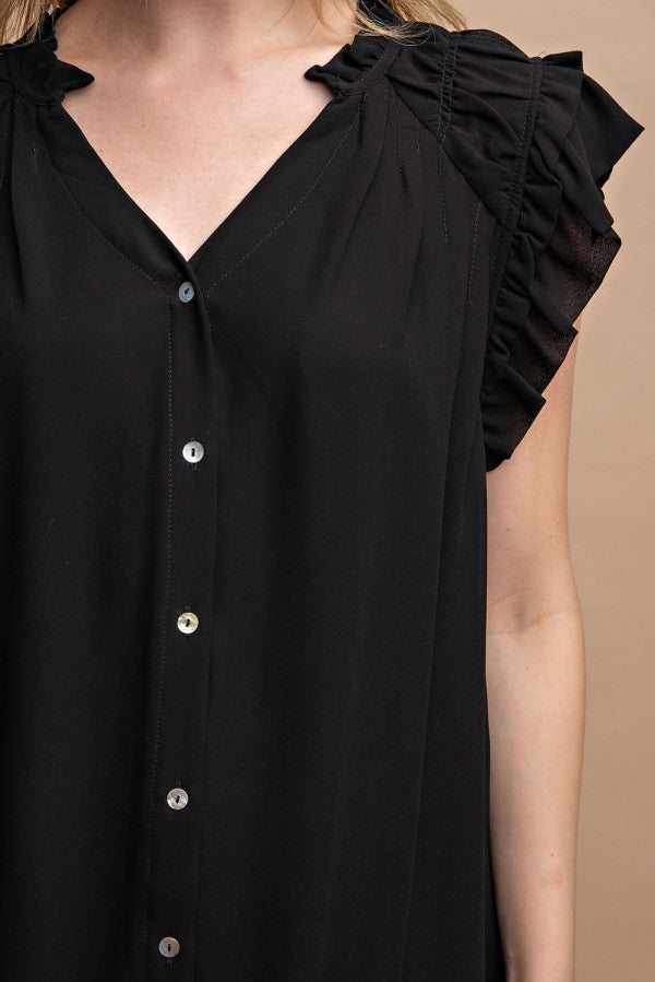 Such a girly top! From the lightness and how dainty it is to the cute ruffles on the shoulders. This fully lined button down is a must have in your closet.