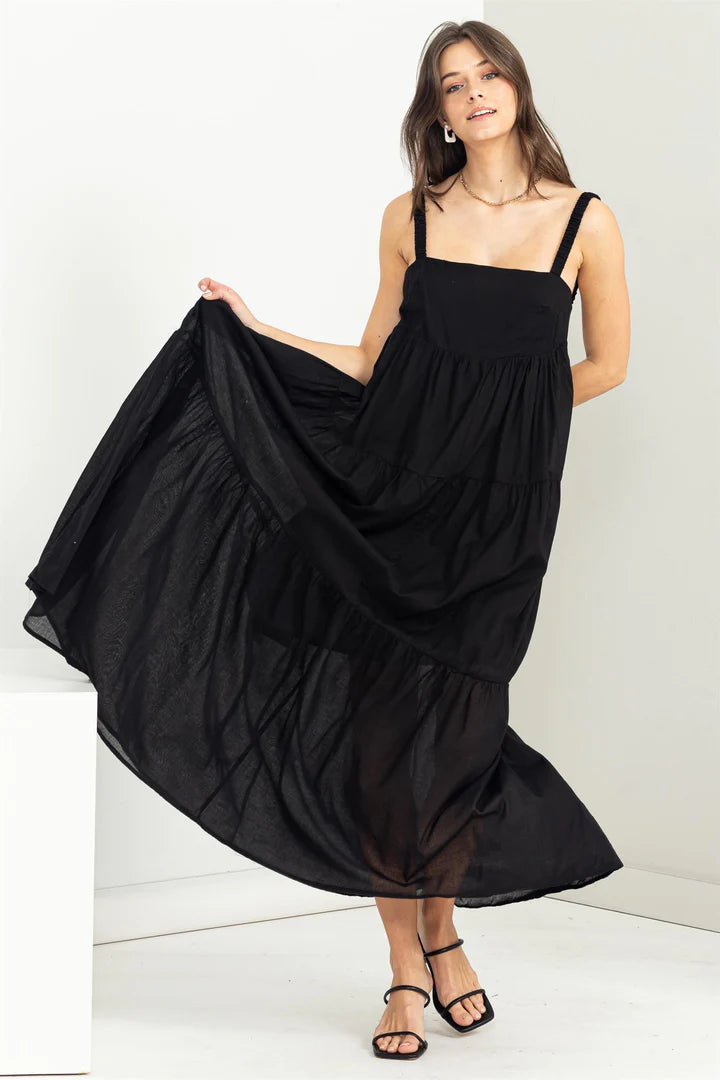So flowy and adorable!! Square neck, elasticated shoulder straps and an empire waist that continues down to a tiered bottom. It also has an open back and it is lined.
