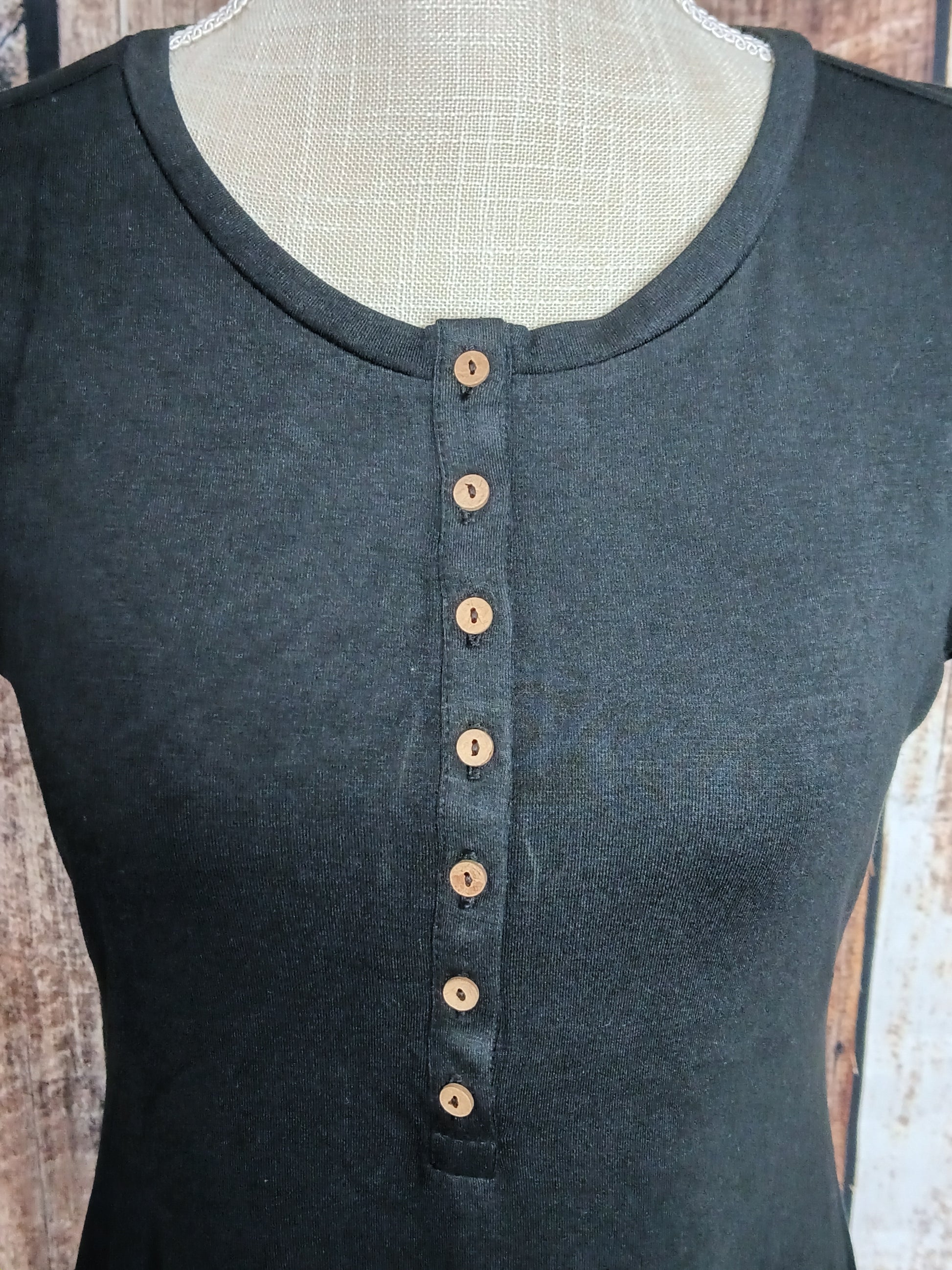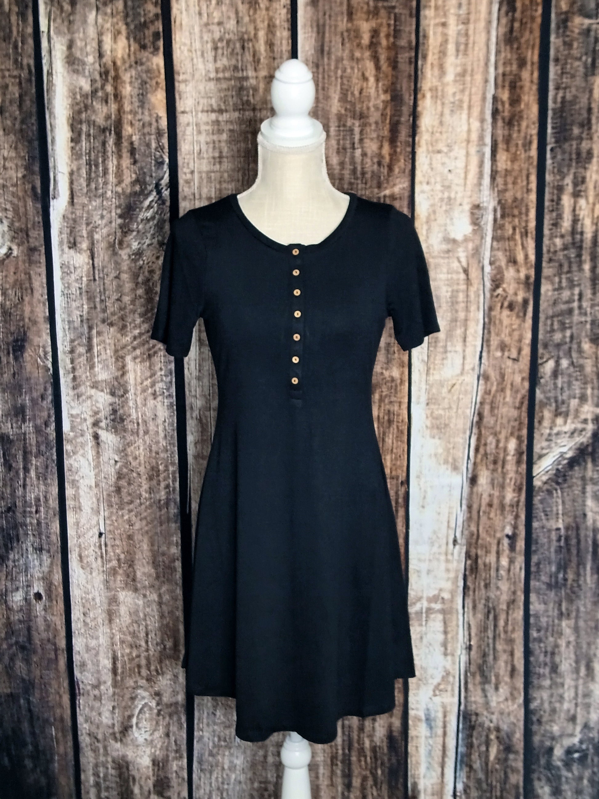 Who doesn't need a little black dress in their closet? This is a short sleeve dress with 7 functional buttons. The dress is knee length.