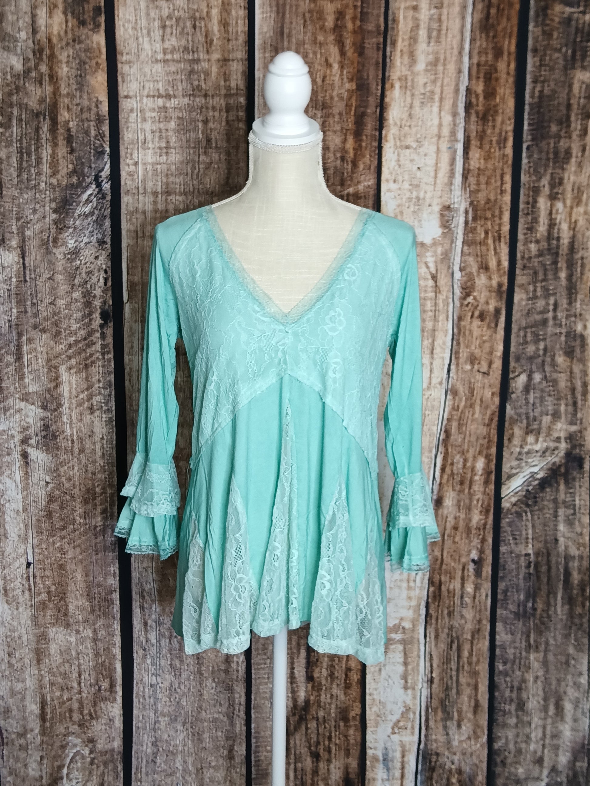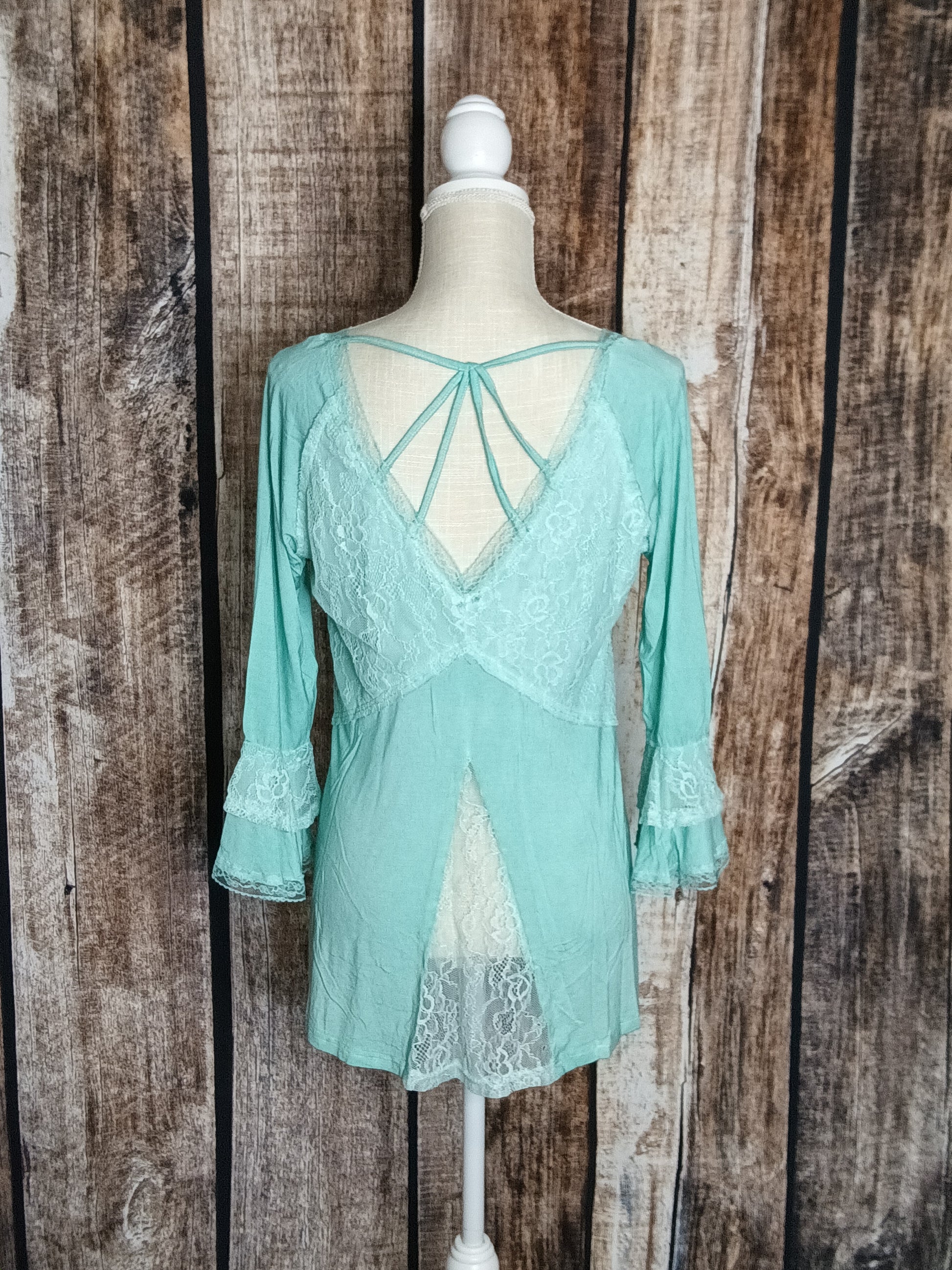 Super girly and dainty top with lots of lace and ruffles. Beautiful paradise green in color. 3/4 sleeve and deep v-neck. Adorable strap detail on back.