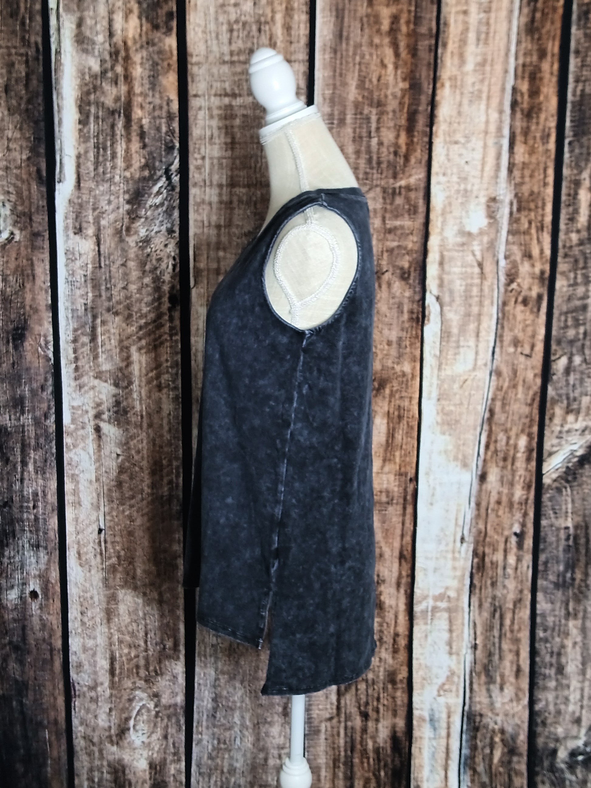 Rock it in this mineral wash, sleeveless, v-neck top with side slits. Hi-Low Hem. Super soft material.