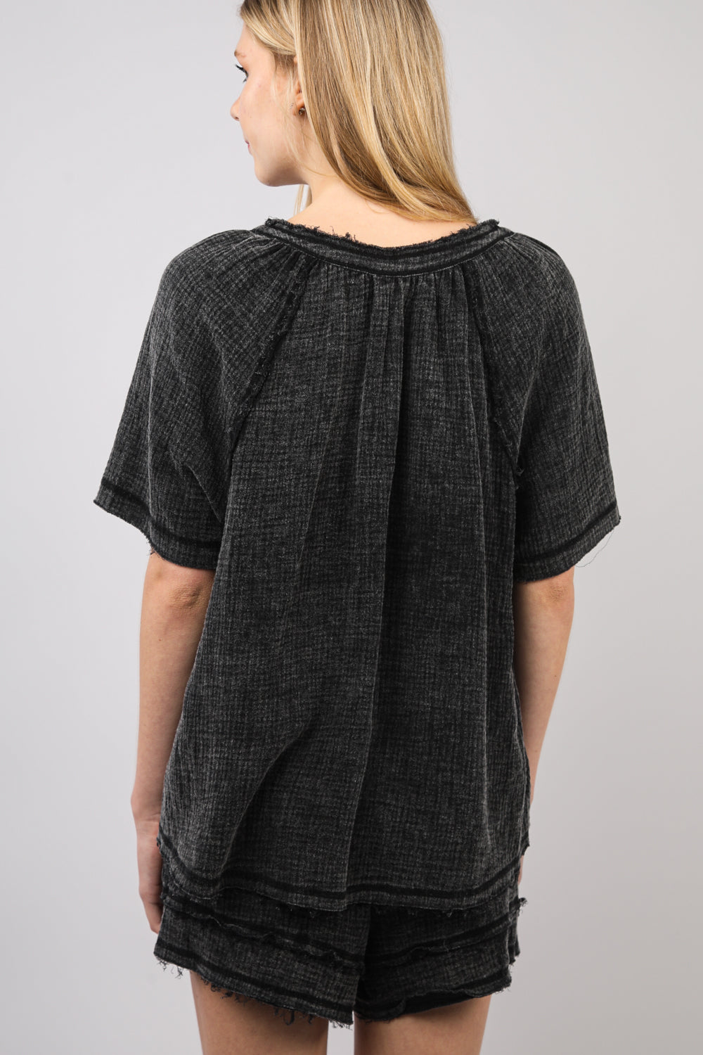 You. Need. This. Set!! It is so adorable and comfy!! It's a gauze, washed material set with raw hem. The top is a v-neck with hi-low hem. The shorts are elastic waist with drawstring and pockets. The shorts are fully lined too!