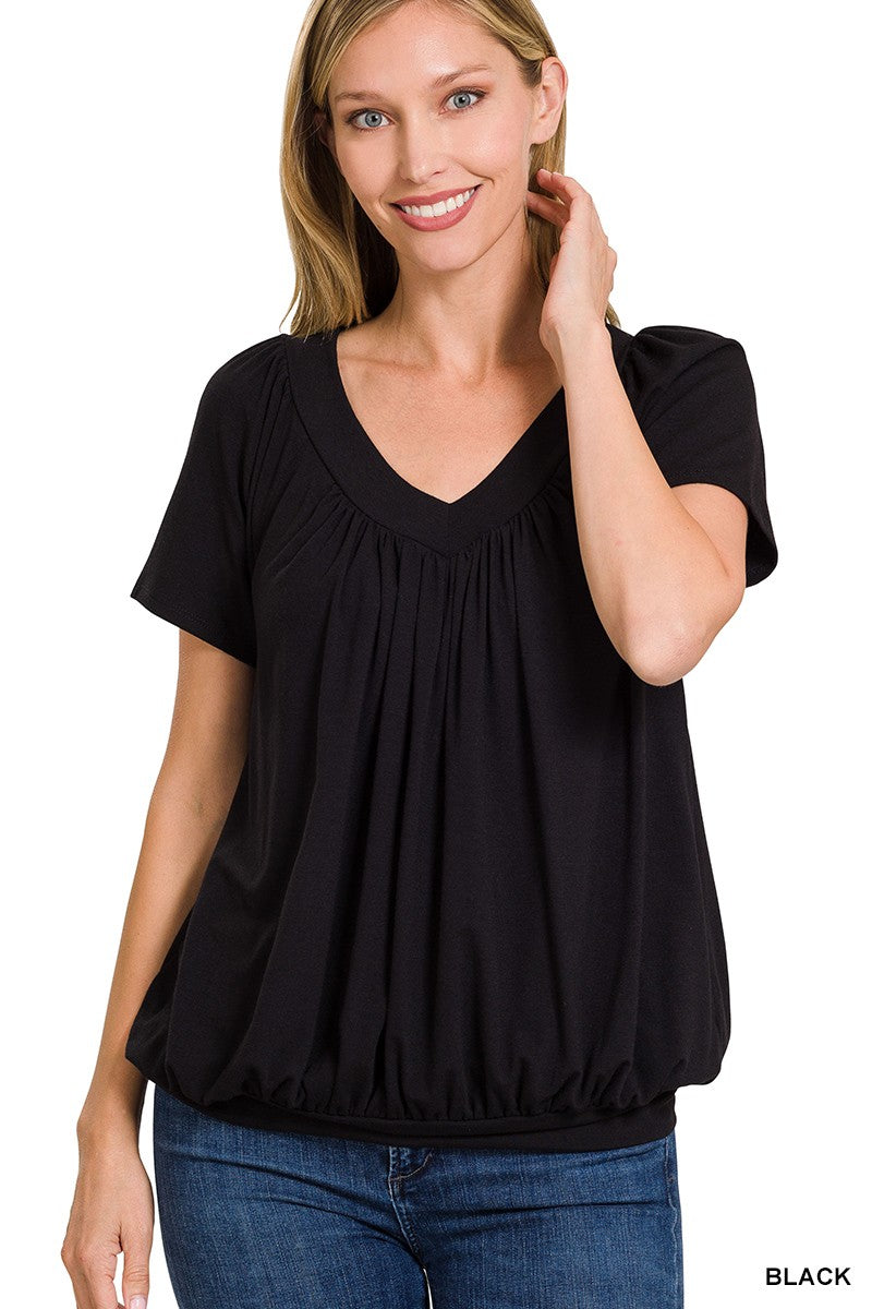 Super cute and versatile top! Very soft material that flows away from your body and gathers at the bottom with a wide band.