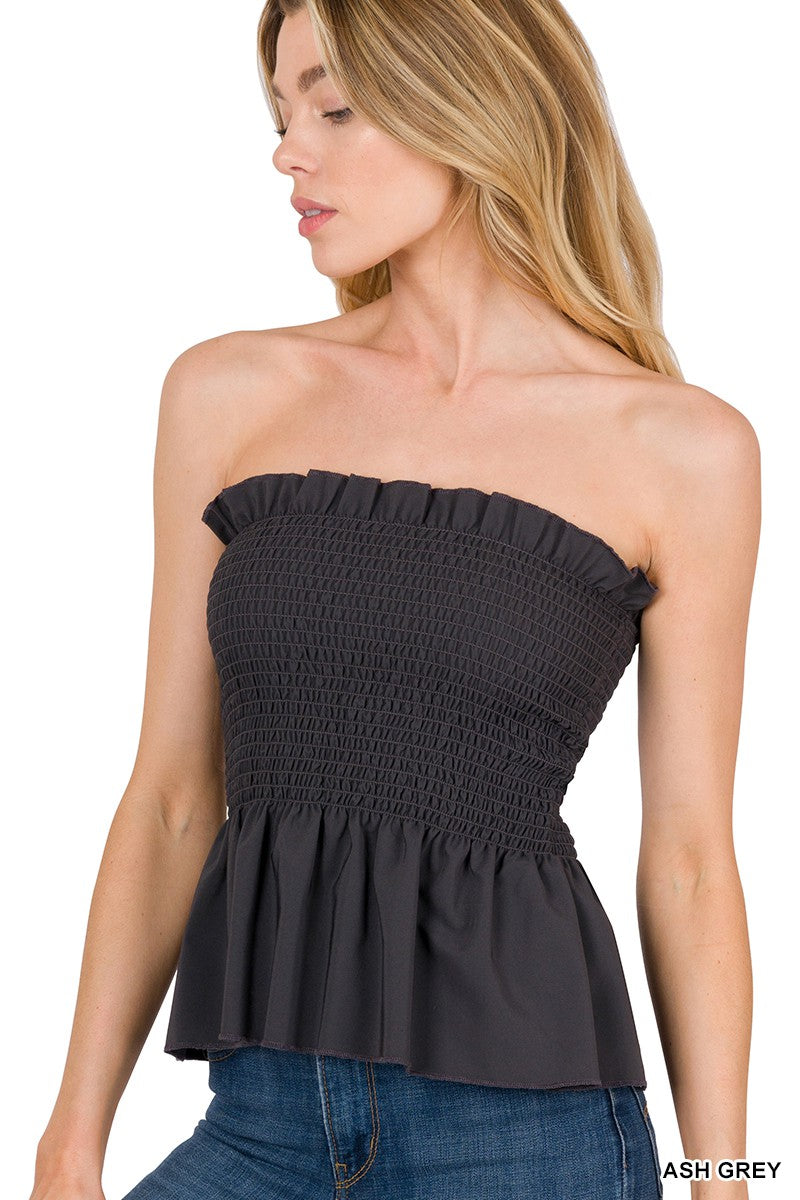 Adorable, smocked tube top with ruffle hem in ash gray. So cute paired with denim shorts! A great summer item to add to your closet.