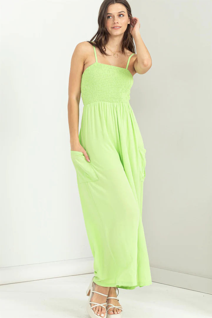 Cute and Stylish!! Beautiful chartreuse color jumpsuit with smocked top and large side pockets. It also has adjustable spaghetti straps and is lined.
