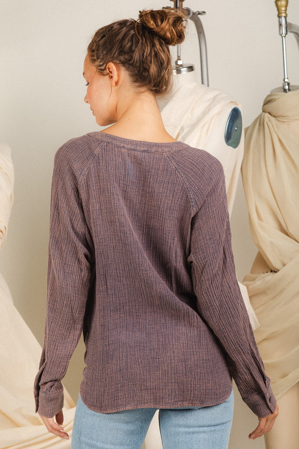 Adorable wrap top in gauze material with v-neck and snap button closure. Perfect to pair with blue jeans.